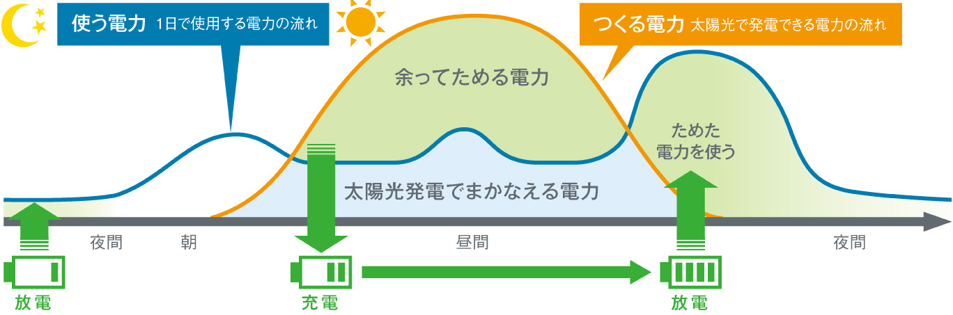 昼間に、太陽光発電で余った電力を蓄電して、発電量の少ない、太陽が沈んだ後などの時間帯に使用します。