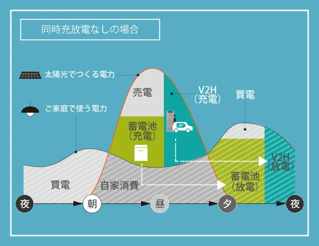 沢山使う時間帯でも同時放電機能で無用な買電をせず、たっぷり家へと電気を供給する事ができます。