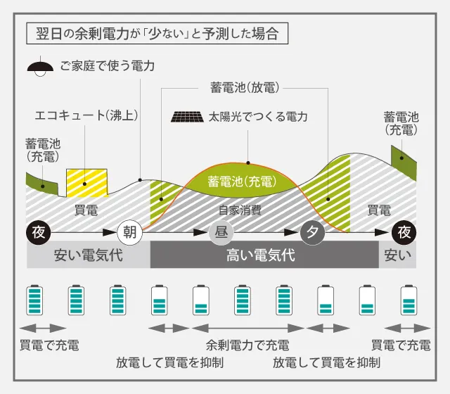 多く家で使うと、どちらかにまだ電気が残っていたとしても、高い時間帯の電気を買電をする必要がありました。